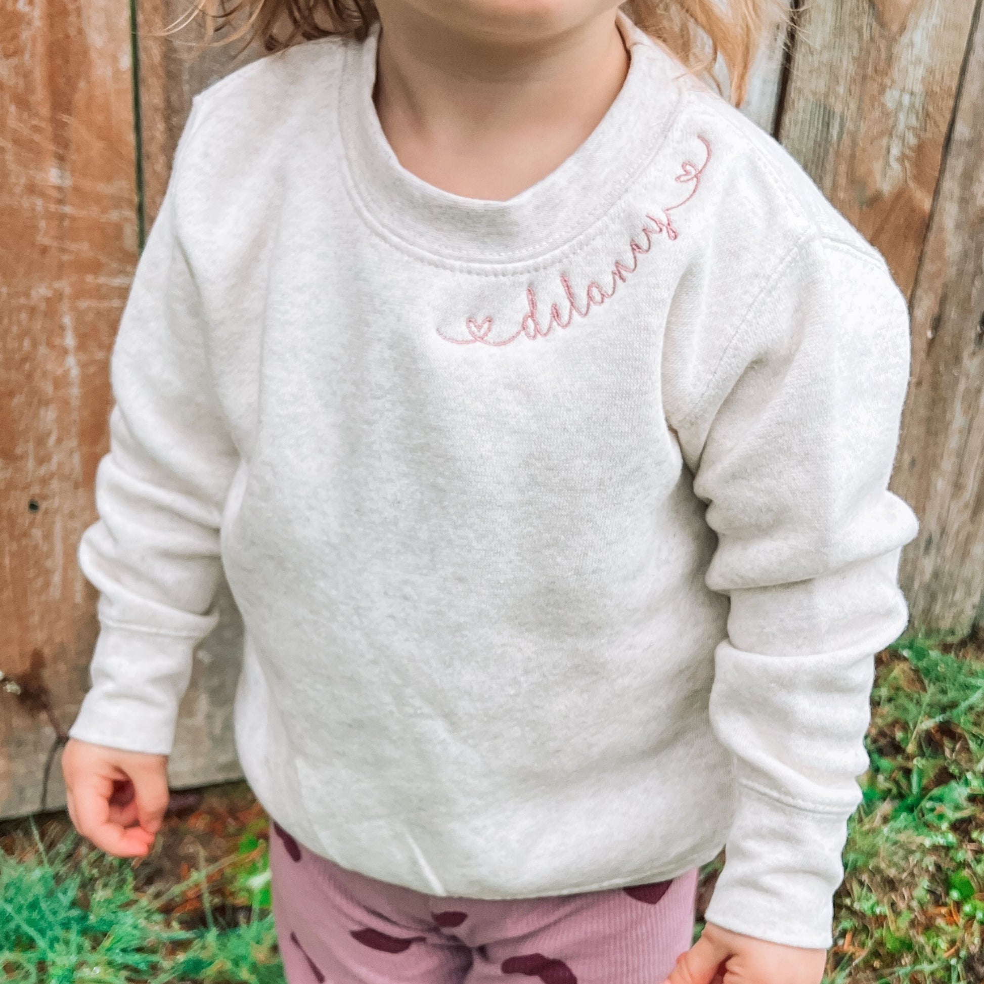 Heart Name Script Neckline Personalized Toddler Name Sweatshirt | Embroidered